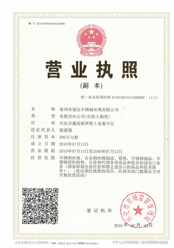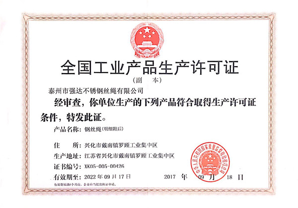 泰州市強達不銹鋼絲繩有限公司位于江蘇興化市戴南經濟開發(fā)區,公司致力于不銹鋼絲繩產品生產,立志成為“國內技術標桿型吊索具生產企業”。以此戰(zhàn)略思想指導,公司堅決貫徹“質量贏市場,管理增效益,誠信贏天下”的質量方針。以完善的服務在國內不銹鋼絲繩市場樹立良好的品牌形象。公司榮獲“江蘇省質量信得過企業。 靈活的管理機制,經驗豐富的